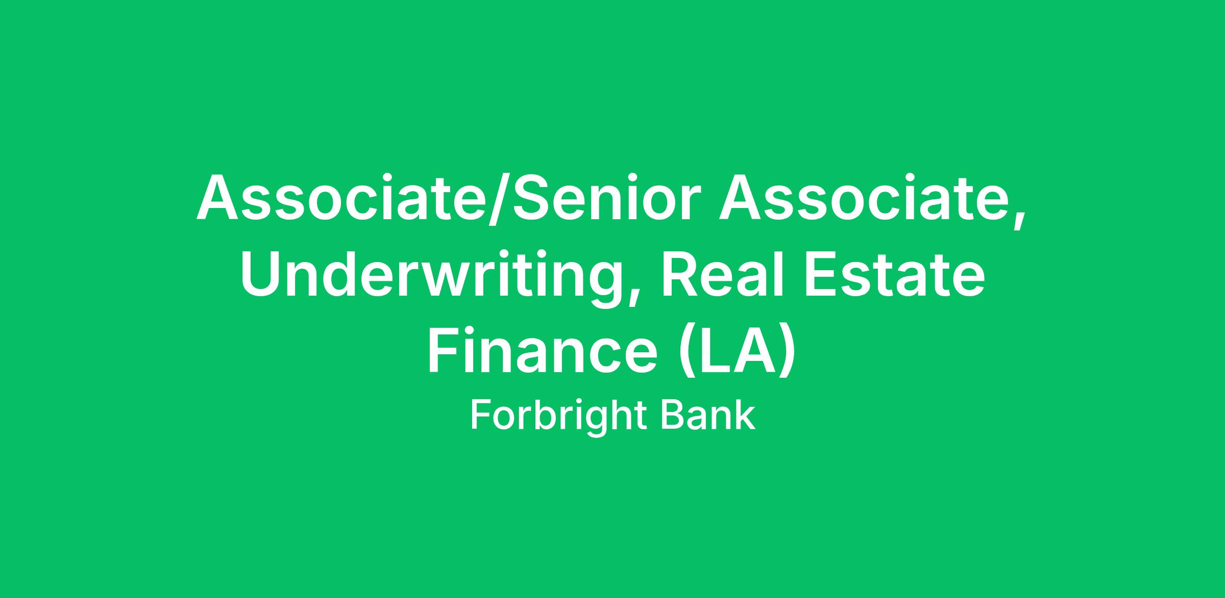 JOB SUMMARY: The Senior Associate is part of the team underwriting and originating Commercial Real Estate finance products at Forbright Bank. This role is responsible for assisting the Real Estate Finance Managing Directors and Directors (the “Originator(s)”) with underwriting lending opportunities and achieve real estate origination goals while simultaneously maintaining acceptable credit quality and return targets.