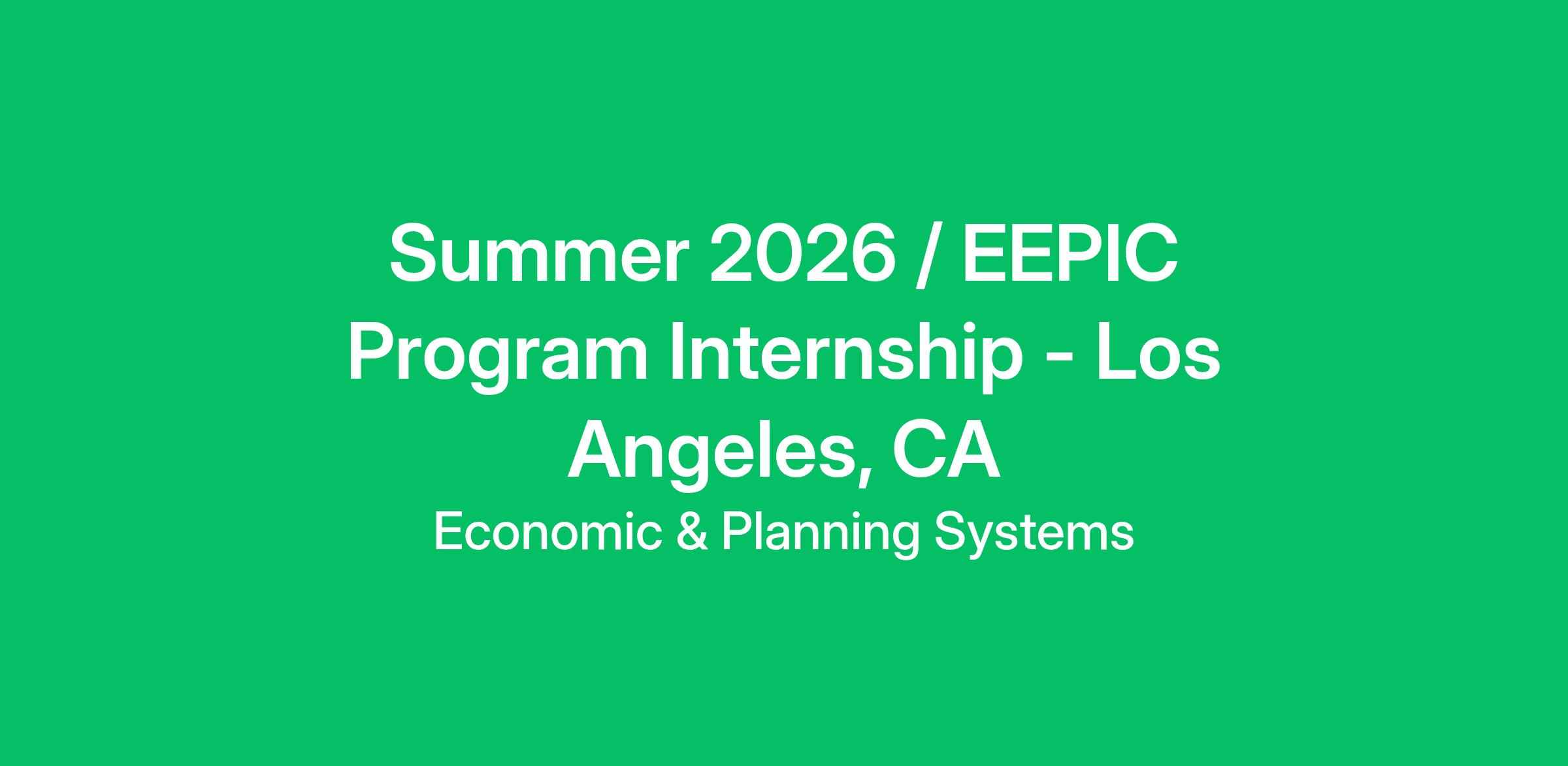 Economic & Planning Systems, Inc. (EPS) is an innovative economics land use consulting firm, distinct in our ability to analyze and creatively resolve complex challenges related to land use policy, urban planning, real estate investment, and public financing. Since 1983, we have served a wide variety of private- and public-sector clients throughout the United States with an emphasis on forward-thinking land use planning, economic sustainability, and urban resiliency.Our goal is to develop well-rounded consultants, experienced in the full range of services offered by EPS. We are passionate about our work and committed to our clients. We also invest in our staff through on-the-job training, a monthly “lunch-and-learn” training series, and staff retreats. We promote a collaborative professional environment both in and out of the office, and recognize that diverse perspectives strengthen our understanding of issues and our services to our clients and their communities.The Internship PositionOver the Summer of 2026, EPS will be offering one traditional summer internship position in its Los Angeles office. This position includes the opportunity to participate in the Environmental Engineering and Planning Internship and Charrette (EEPIC) program (see EEPIC program details below). Interns at EPS work under the direction of project managers and may assist in research and analyses related to real estate feasibility, fiscal and economic impact analysis, public finance, land use policy, revitalization/ redevelopment, and regional economics.The internship opportunity will be in-person, located at EPS’s downtown Los Angeles office in Summer 2026 (except during the EEPIC program, as described below). The internship is a paid position, and the intern will work approximately 24 hours per week, with the exception of the 2-week EEPIC program planning charrette, when additional hours will be required. Interns are eligible for paid sick leave but are not eligible for other employee benefits, except as mandated by applicable law.EEPIC ProgramIn addition to a traditional internship with the firm, EPS participates in the EEPIC program: a collaborative program amongst seven firms that aims to expand representation within the environmental, engineering, economics, and planning fields by creating meaningful opportunities for students across all backgrounds. This includes, but is not limited to, students who identify as Black, Indigenous, or People of Color (BIPOC); veterans; individuals with disabilities; and students who are the first in their families to attend college. As part of the program, the EPS intern will participate in an intensive in-person two-week charrette in July, tackling a real-world project in partnership with EEPIC interns from other firms. Additional charrette details can be found on the EEPIC program flyer by clicking this link. Please note that travel and lodging will be provided (if needed) during the charrette portion of the internship program only, and will not be provided during the traditional summer internship.Does This Describe You?You are a current upper division undergraduate student or graduate student seeking hands-on experience in land economics, public finance, city and regional planning, public policy, or similar field. You are interested in the interplay between economics and public policy in the development of urban systems, and are passionate about work that results in strategies to promote great and sustainable places. You want to use quantitative research and analysis to help communities expand in an equitable and sustainable way, by planning for healthy, diverse neighborhoods, balanced economic growth, affordable housing, enhanced transit and public services, new parks and open spaces, and innovative land use investments.Qualifications and Skills- Current upper division undergraduate or graduate student